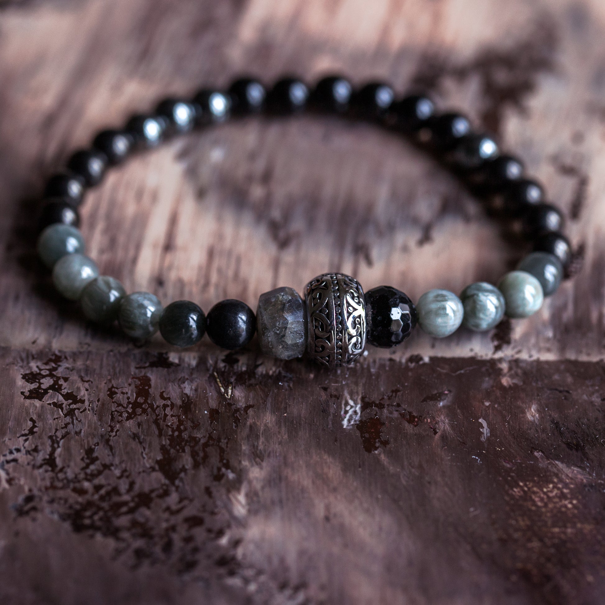 MAGIC AND PROTECTION Grey Hawk Eye, Labradorite, Black Tourmaline, Shungite, Jet, Black Obsidian and Hematite Unisex Bracelet